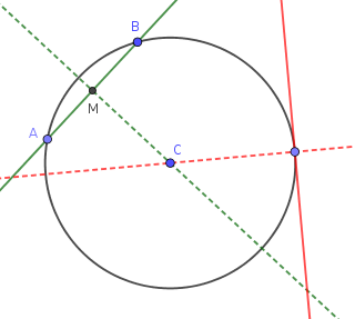 – La circunferencia pasa por los puntos A y B. Si a la recta que pasa por A y B le trazamos una perpendicular por el punto medio del segmento AB, dicha perpendicular pasa por el centro de la circunferencia.