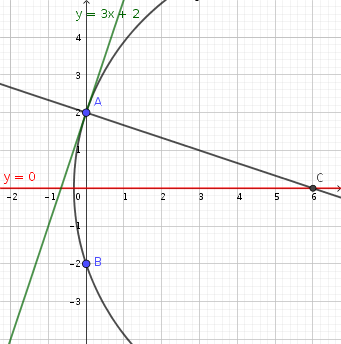 Dados los puntos A(0,2) y B(0,-2), determina la ecuación general de la circunferencia que pasa por A y B, y además, es tangente a la recta y=3x + 2