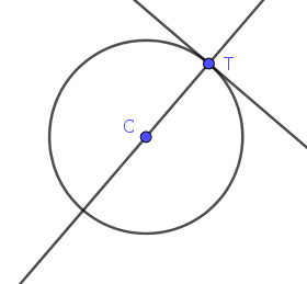 Debemos recordar que dada una recta tangente a una circunferencia, si le trazamos una perpendicular por el punto de tangencia, ésta pasa por el centro de la circunferencia