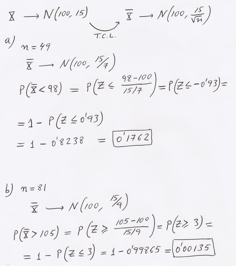 – b) Calcula la probabilidad de que una muestra de tamaño 81, extraída de esa población, tenga una media superior a 105.