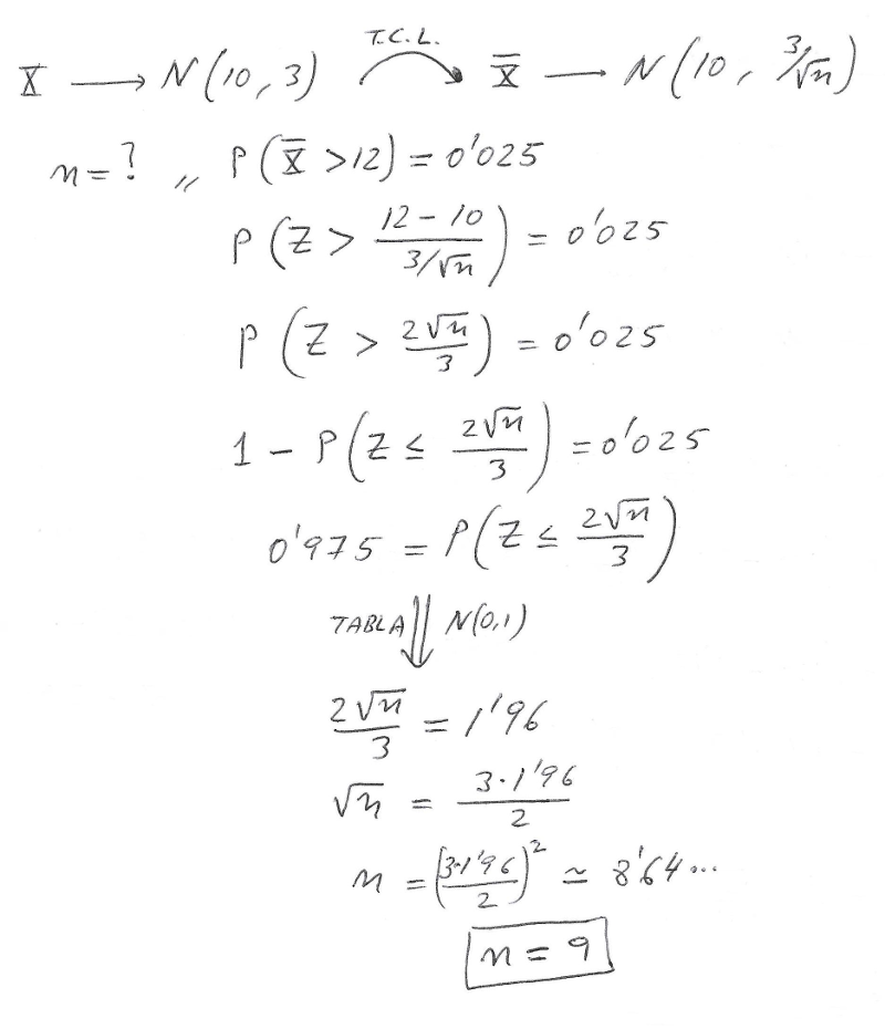 se distribuye según una ley normal de media 10 y desviación típica 3. Determine el tamaño de una muestra extraída de la población, de modo que la probabilidad de que la media muestral esté por encima de 12 sea de 0,025