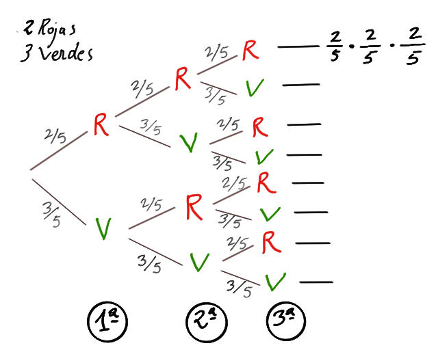 En una urna hay dos bolas rojas y tres verdes. Se realizan tres extracciones con reemplazamiento (se mete la bola después de sacarla). Realiza el desarrollo del correspondiente diagrama de árbol y calcula la probabilidad de que salgan dos rojas y una verde.