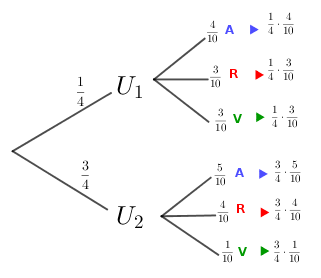 Si es A="sacar bola azul" y aplicamos Probabilidad total, tendremos: