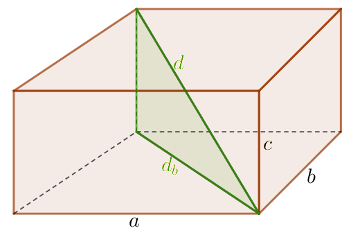 Ahora nos fijamos en el triángulo rectángulo verde y calculamos la diagonal del ortoedro