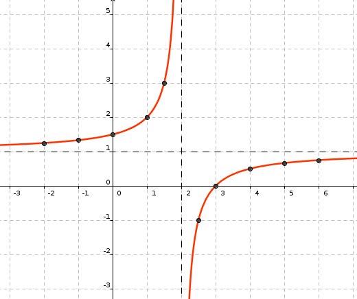 – Dibujamos la gráfica, haciéndola pasar por los puntos que tenemos dibujados y recordando que se tiene que acercar cada vez más a las asíntotas, pero sin llegar a tocarlas.