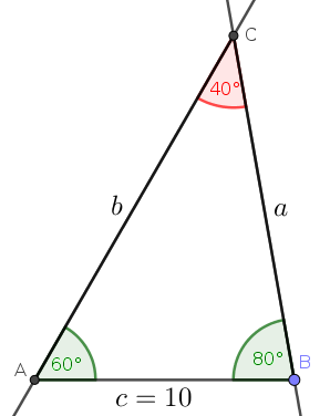 Resuelve un triángulo sabiendo que uno de sus lados mide 10 m y que dos de sus ángulos tienen 60 y 80 grados respectivamente.