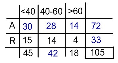 A la Junta General de Accionistas de una empresa asisten 105 accionistas de los cuales 45 tienen menos de 40 años y 18 más de 60 años. Sometida a votación una propuesta, es rechazada por la tercera parte de los menores de 40 años, por la tercera parte de los que están entre 40 y 60 años y por 4 personas mayores de 60 años; los demás la aceptan.