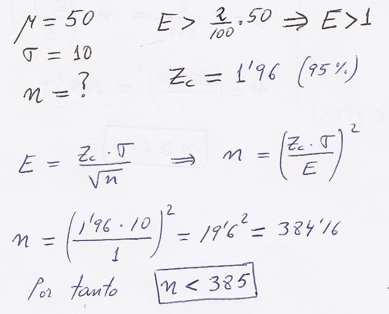 La edad media de esperanza de vida de una población es 50 años, con una desviación típica de 10 años. Una compañía de seguros quiere determinar el tamaño de una muestra para que la estimación difiera del valor 50 en al menos 2% de este valor, tomando como nivel de confianza el 95%. Calcula el tamaño de dicha muestra.