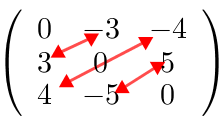 Matriz antisimétrica (o hemisimétrica): matriz cuadrada en la que los elementos a ambos lados de la diagonal principal son opuestos (iguales pero con distinto signo).