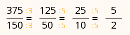 fracciones simplificar 💬 1 Ejercicios_Resueltosfraccionessimplificar_fracciones Simplifica las siguientes fracciones: SOLUCIÓN Comentar el ejercicio Mensajes 29 de mayo de 2014, 05:09 375/150 = 5/2