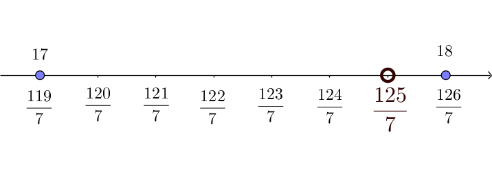 Eso ya nos indica que estará entre 17 y 18, por lo que dividimos la unidad (de 17 a 18) en 7 partes iguales.