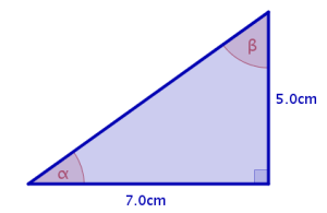 Ahora calculamos sus ángulos. Dado que el triángulo es rectángulo, podemos aplicar las razones trigonométricas. En este caso se puede usar seno, coseno o tangente. Usaremos, por ejemplo, la tangente: