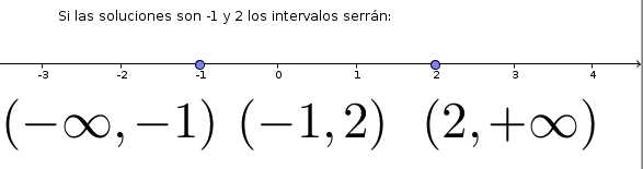 – 3) Dibujamos en la recta real las soluciones de la ecuación anterior y los posibles puntos de discontinuidad de la función. Ello dejará la recta real dividida en intervalos.