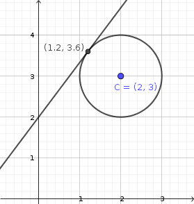 Si usamos el método de la distancia del Centro a la recta, debemos hallar esa distancia y compararla con el radio.Aplicamos la formula de la distancia de un punto a una recta y teniendo en cuenta que el punto es el centro (2,3)