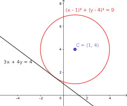 Como es tangente a la recta, el radio coincidirá con la distancia del Centro a la recta (aplicamos la fórmula de la distancia de un punto a una recta)