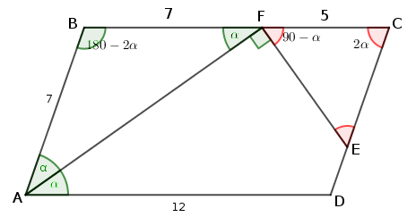 El triángulo ABF tiene dos ángulos iguales, por tanto es isósceles y por tanto el segmento BF vale 7.