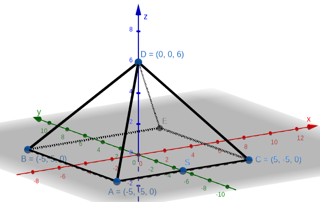 y es un lado de la pirámide. Halla el plano que es vertical y contiene a la puerta y al centro O. Interseca ambos planos obteniendo la ecuación de la recta