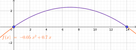 Si hallamos los puntos de corte con el eje X obtendremos los dos puntos en los que la pelota toca el suelo (que serán antes de lanzar y después al caer)