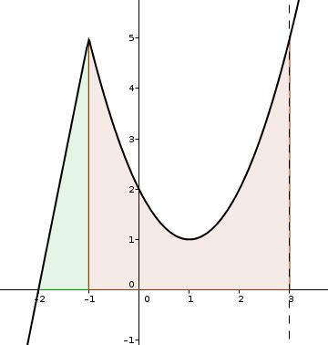 ![A = \left. \frac{5x^2}{2}+10x \right]_{-2}^{-1} + \left. \frac{x^3}{3} - x^2 + 2x \right]_{-1}^{3} =\frac{71}{6} u^2 A = \left. \frac{5x^2}{2}+10x \right]_{-2}^{-1} + \left. \frac{x^3}{3} - x^2 + 2x \right]_{-1}^{3} =\frac{71}{6} u^2](local/cache-TeX/8cec8383a2b81b623612dc8ec5023561.png)
