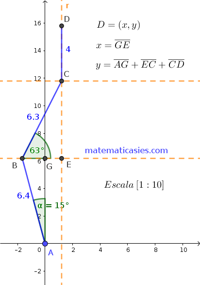 Mediante trigonometría se pueden calcular las coordenadas del punto D
