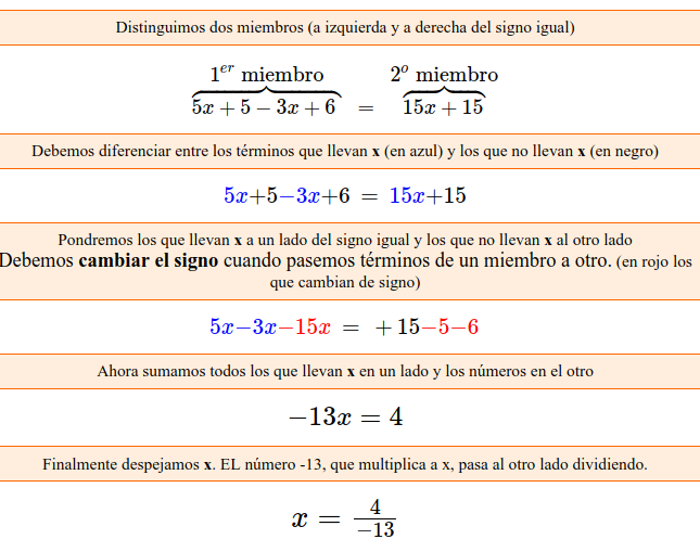 ecuaciones grado1 denominadores 💬 3 ecuacionesecuaciones con denominadoresecuaciones de primer gradoEjercicios_Resueltos Resuelve la ecuación: SOLUCIÓN Ponemos denominador a los términos que no tengan Hacemos el m.c.m. de los denominadores: m.c.m.(3,5,1) = 15 Quitamos denominadores Quitamos paréntesis Comentar el ejercicio Mensajes 4 de marzo de 2012, 21:00, por pepi comooooo se haceeeee ?????????????????? 16 de marzo de 2012, 11:46 Primero quita denominadores (m.c.m.). Después pasa todas las x a un lado y los números sin x detrás del igual. Y ya sólo tienes que resolver. 19 de abril de 2013, 14:39, por LILIANA CUELLO X+1.5(DENOMINADOR)Y (-x-2).3 =x+1.Con m.d.m 15 .y ya aplico la distributiva...5x+5-3x-6 todo c denominador comun 15. 5x/15-3x/15-x=-5/15-6/15+1 y ahora calcula x=-13/15 Y 4/15....4/15.15/13=4/13