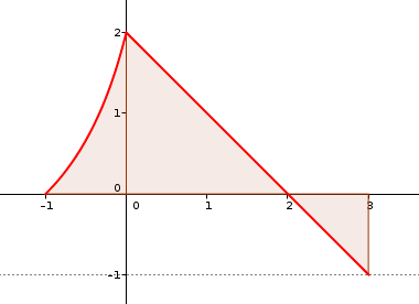 Halla el área del recinto rayado que aparece en la figura adjunta sabiendo que la parte curva tiene como ecuación y = \frac{2x+2}{1-x}