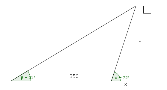 Se trata de un problema clásico de trigonometría que se resuelve usando las tangentes de los ángulos de 31 y 72. De esa forma se obtienen dos ecuaciones y un máximo de dos incógnitas (bastaría con resolver el sistema).